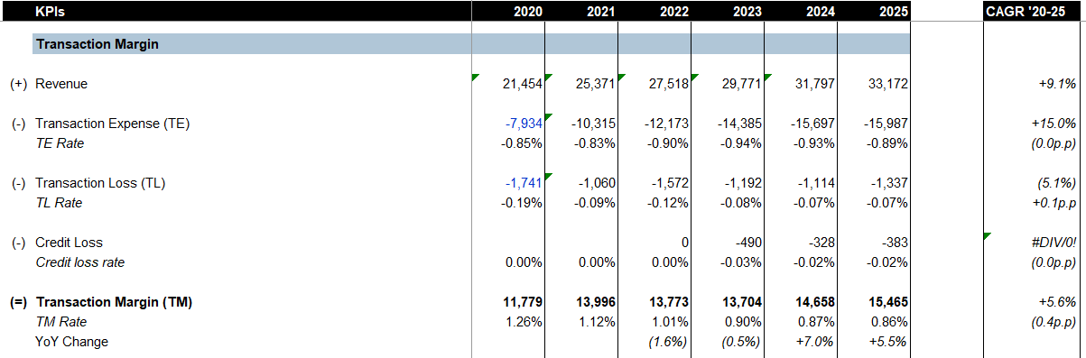 Transaction margin increased by +5.5%, in line with the historical average. TM rate stood at 0.86% of TPV, which is stable vs. the prior year, but has fallen from 1.26% in 2020.
