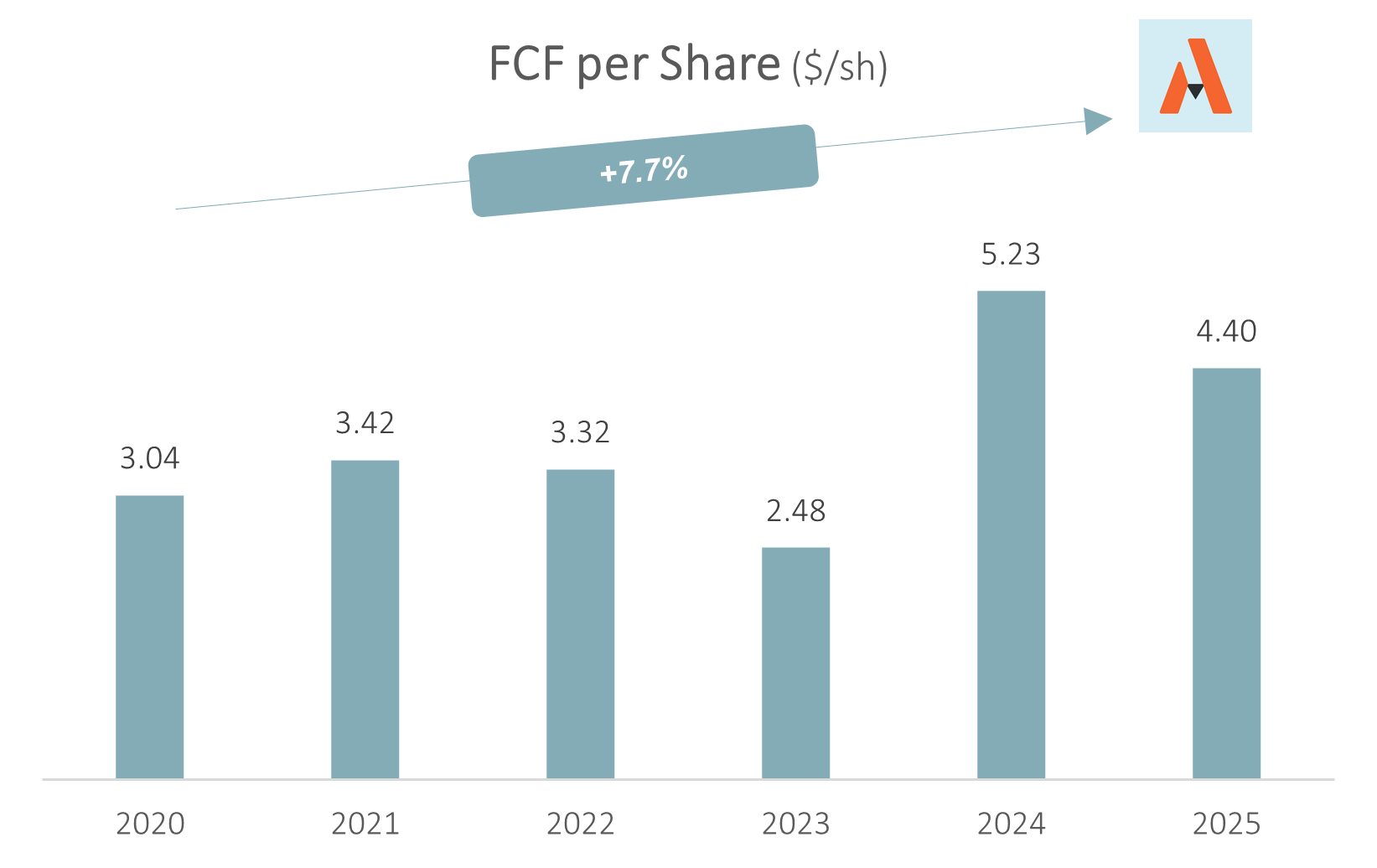FCF per share stood at $4.4 during 2025, implying a FCF yield of 11% under current share price. But, under current guidance, a lower FCF must be expected for the year ahead; therefore, we can’t consider the current multiples as valid.