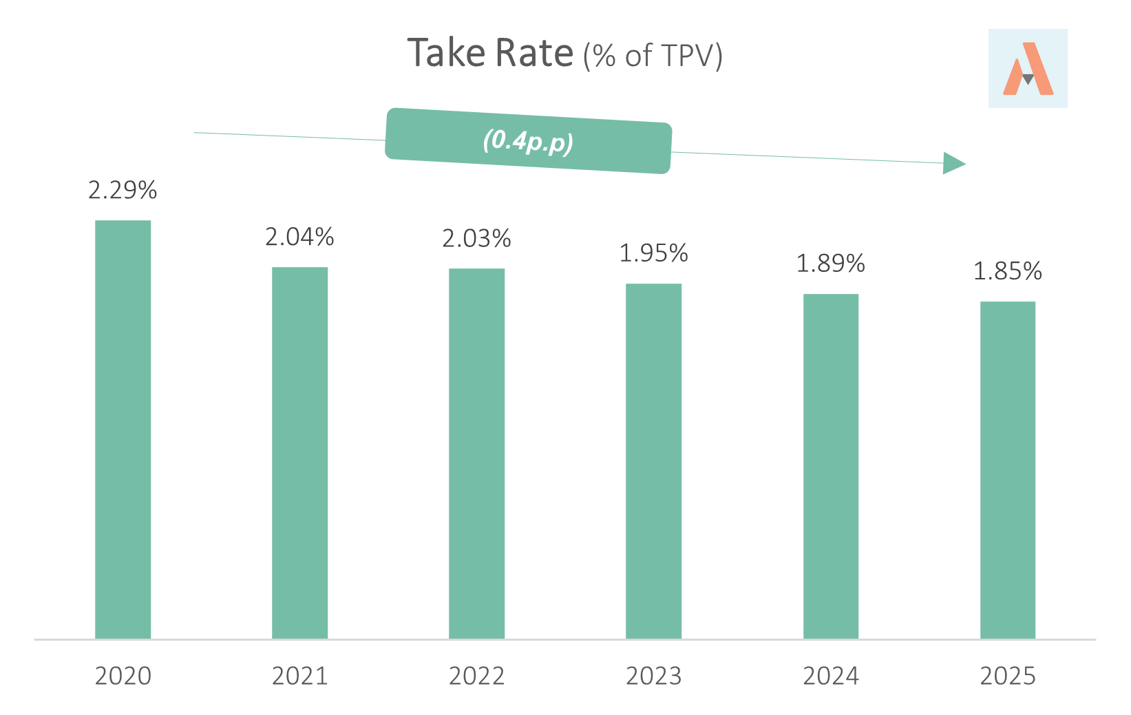 As other services grow faster than branded checkout, take rate is declining from 2.3% in 2020 to 1.85% in 2025.